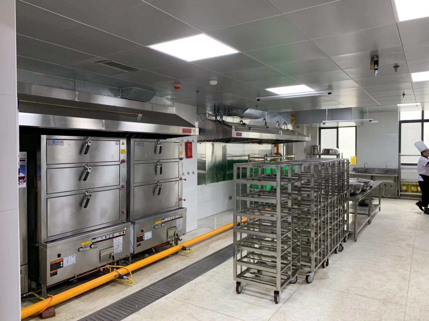 照明分為基本照明和補充照明,基本照明是指整個午夜视频免费在线观看都要保持在每個區域的屋頂中心處布置照明,補充照明就是在重點部位補充照明,需要補充照明的有洗滌區、打荷區、切配台、熱廚區等,補充照明主要以炊具設備自帶的照明係統(如防爆燈)為主,電源由炊具設備統一提供,也可以另外添加燈具,滿足照明要求。