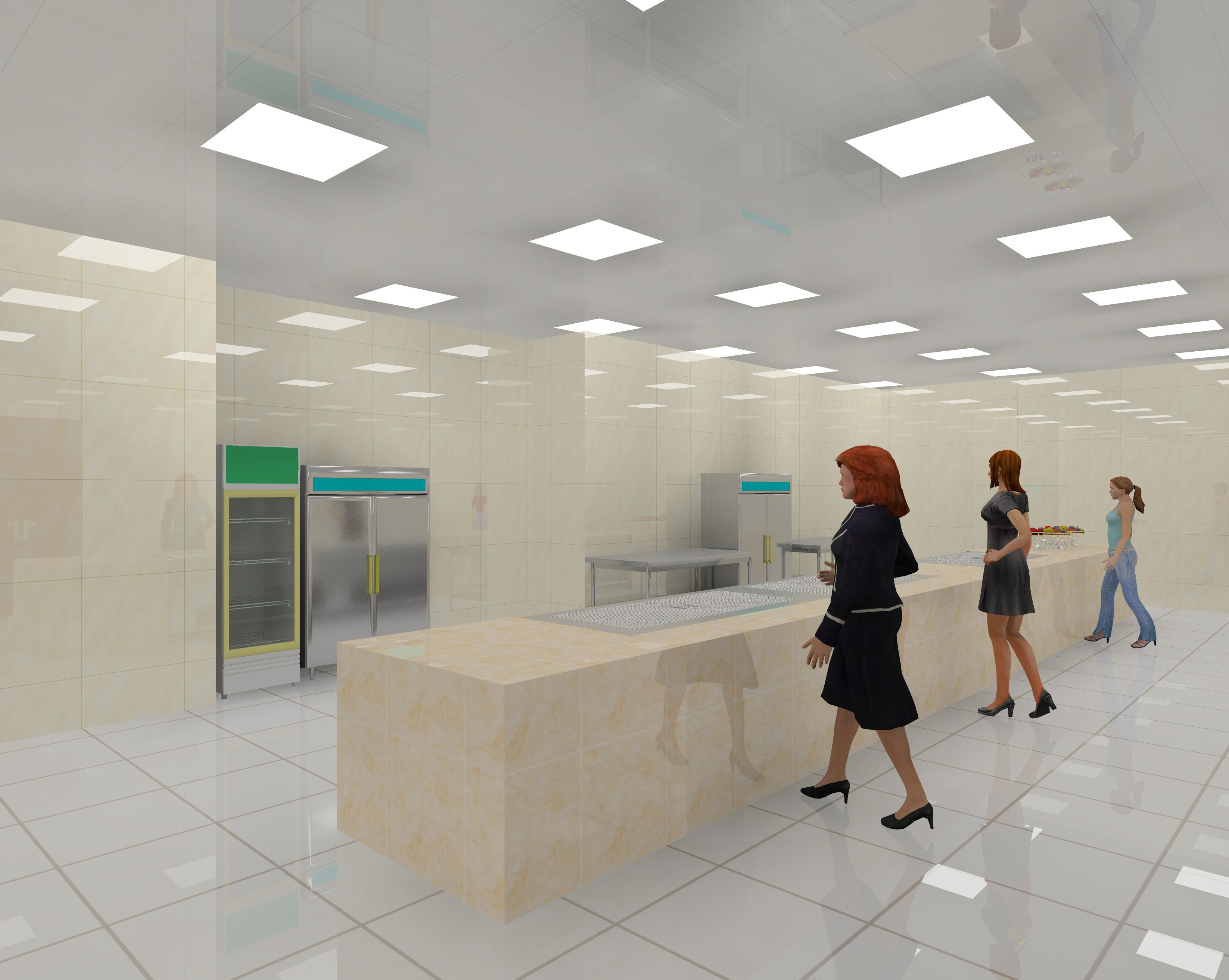 (5)有些較大的快餐店、食堂的售餐區,有明亮的采光照明,送餐通道寬敞,並且在背景牆上有精美的裝飾。