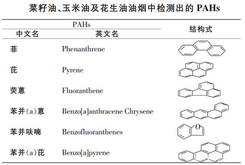 再來看PAHs,PAHs即多環芳烴。在此前的報道中,就曾指出食用油在高溫過程中會產生具有生殖毒性、致癌性及致突變型的多環芳烴有機物,但由於不確定物質的具體成分,不少人也是半信半疑。但隨著苯並芘、二苯並蒽等物質在菜籽油中的檢出,人們陸續開始認識到油煙中PAHs的真麵目。根據對菜籽油、花生油以及玉米油的檢測,油煙中的PAHs主要包括菲、芘、熒蒽、苯並蒽、苯並呋喃以及苯並芘等,其中花生油油煙中的PAHs含量最高,達到了22.8ug/m3,其次是玉米油,含量為5.50ug/m3,菜籽油僅為1.08ug/m3。而玉米油油煙中除了上述物質,還包含了苯並呋喃。