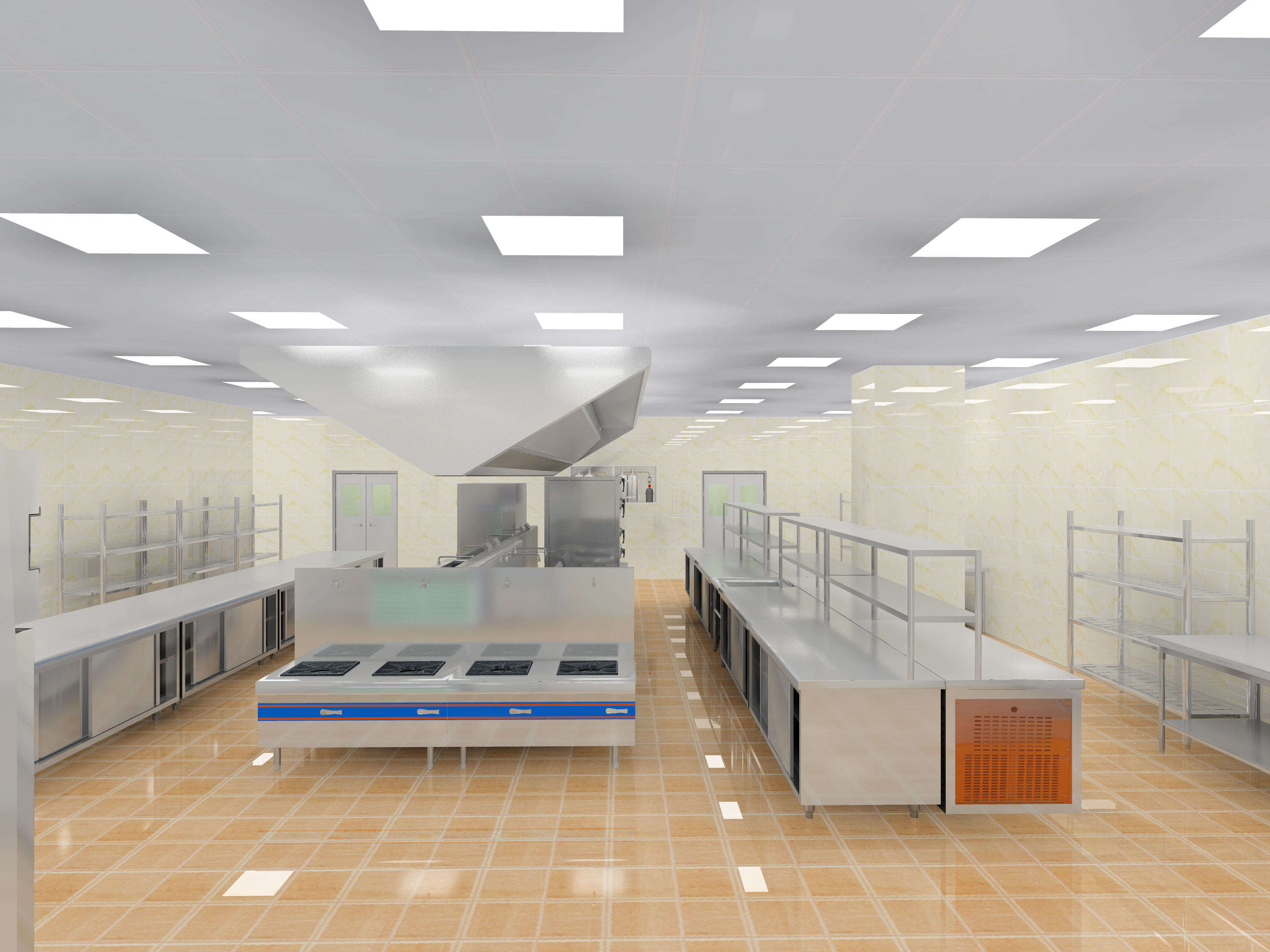 庫房應選用在方便進貨及領用食材,保持道路暢通,在庫房運輸的走廊上寬度不低於1.5m。