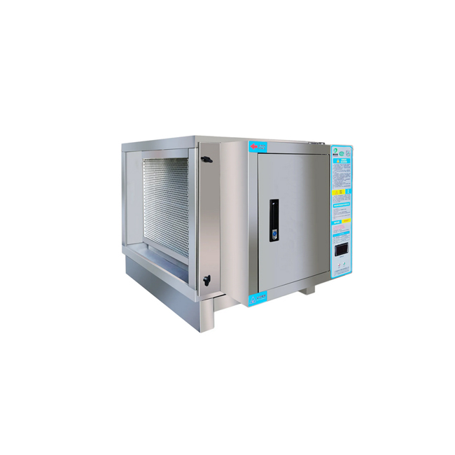 低空油煙淨化器為雙區式靜電吸附型,用來去除細微粒徑油煙分子和其它空氣中的雜粒。雙區式是指內部電場的高壓電離區與低壓吸附區,氣體中的油煙微粒在經過電場的高壓電離區時,油煙分子會被電離並帶有正或負電荷;之後經過低壓區時,將會因電場力的效果而吸附在極板上,流向集油槽。