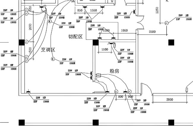 5、將電源插座布局在動力設備周邊,電源插座的安裝高寬比根據廚具廠家規定安裝,其電源插座為安全性防潮插座防水盒暗電源插座,因動力配電箱負載容積很大,因此 選用放射性式配電設備。配電櫃部位應安裝在有利於檢修查詢的地區而且避開自來水點。
