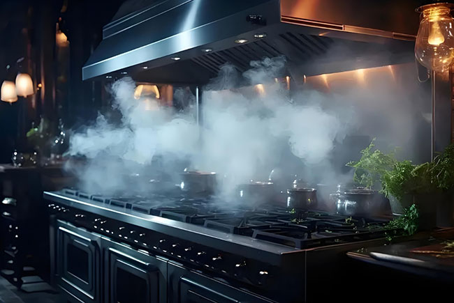 廢氣主要是油煙,蒸汽,熱氣,濕氣,還有下水道散發的黴味,柴油散發的氣味,滲漏的燃氣等,主要通過排煙罩排到室外,沒有排煙罩的工作間靠通風設備派出。例如,粗加工間,海鮮暫養間,殺魚間濕氣大,有腥味,不及時通風換氣,過於潮濕就容易發生黴變,要及時清掃,及時通風,排除濕氣。