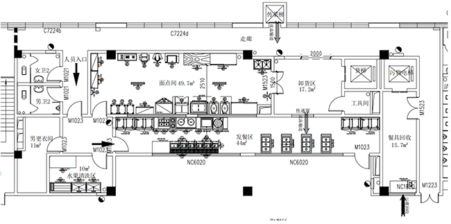 備餐區→涼菜間→午夜视频免费在线观看粗加工區→午夜视频免费在线观看熱加工區→排出空外
